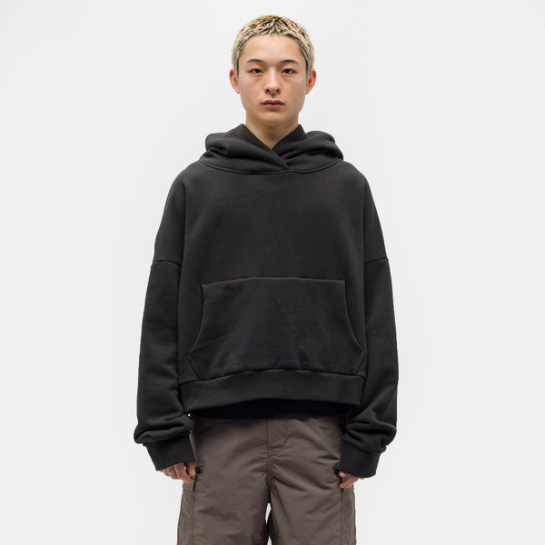 Entire Studios unisex organic cotton relaxed hooded sweatshirt in black. Shop signature sweats, cargos, outerwear, and more from Entire Studios at Notre.