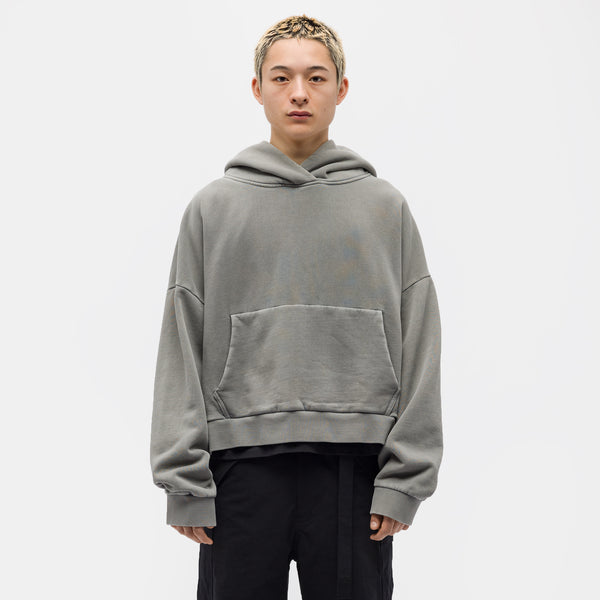 Entire Studios unisex organic cotton relaxed hooded sweatshirt in grey. Shop signature sweats, cargos, outerwear, and more from Entire Studios at Notre.