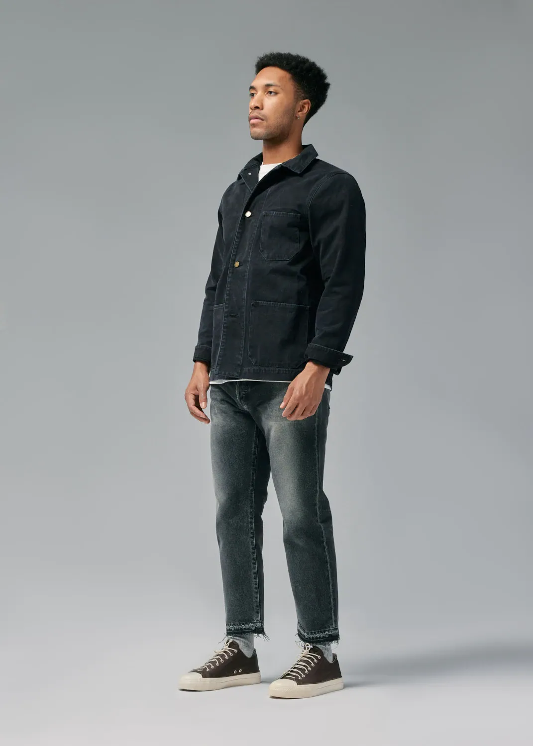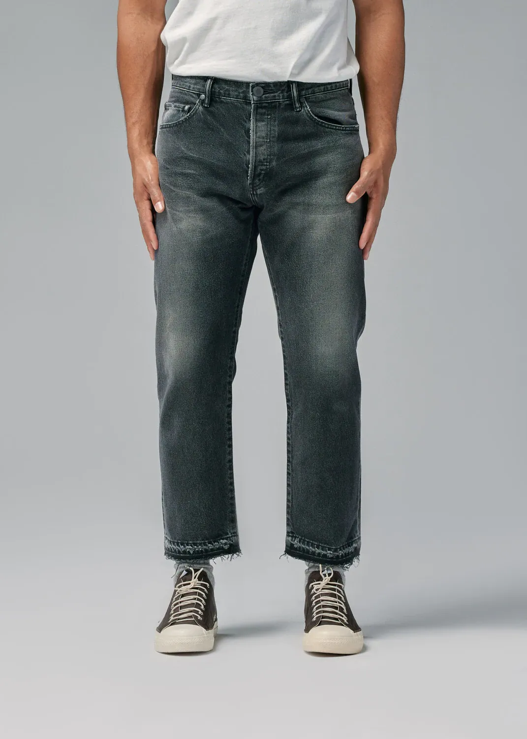 Japanese 3x1 woven denim in light indigo. Five-pocket design with a button fly. Slim straight fit with a slightly dropped crotch and cropped inseam. Vintage-inspired distressing throughout and raw-edge hems. Tonal stitching. Made in Japan.