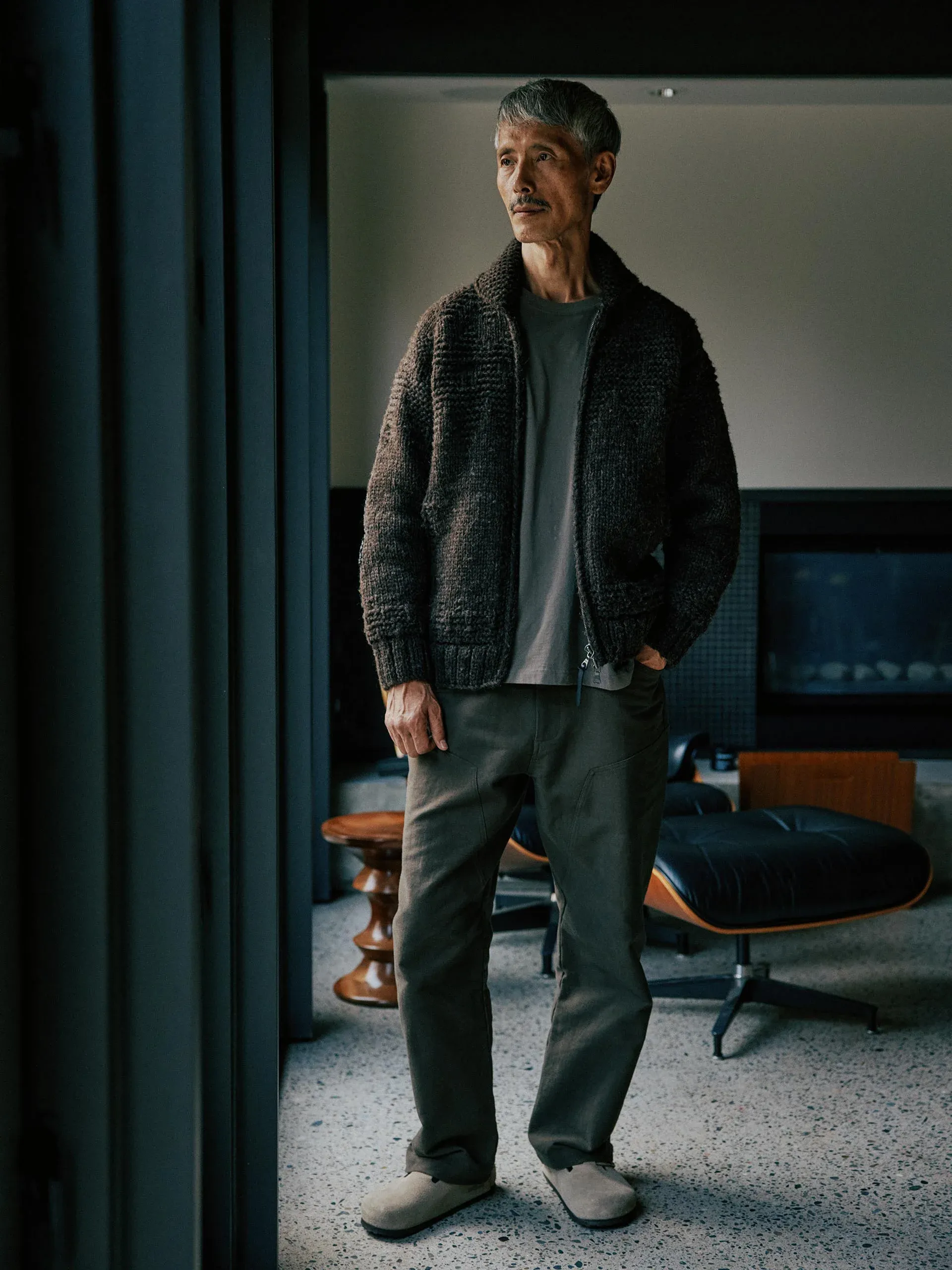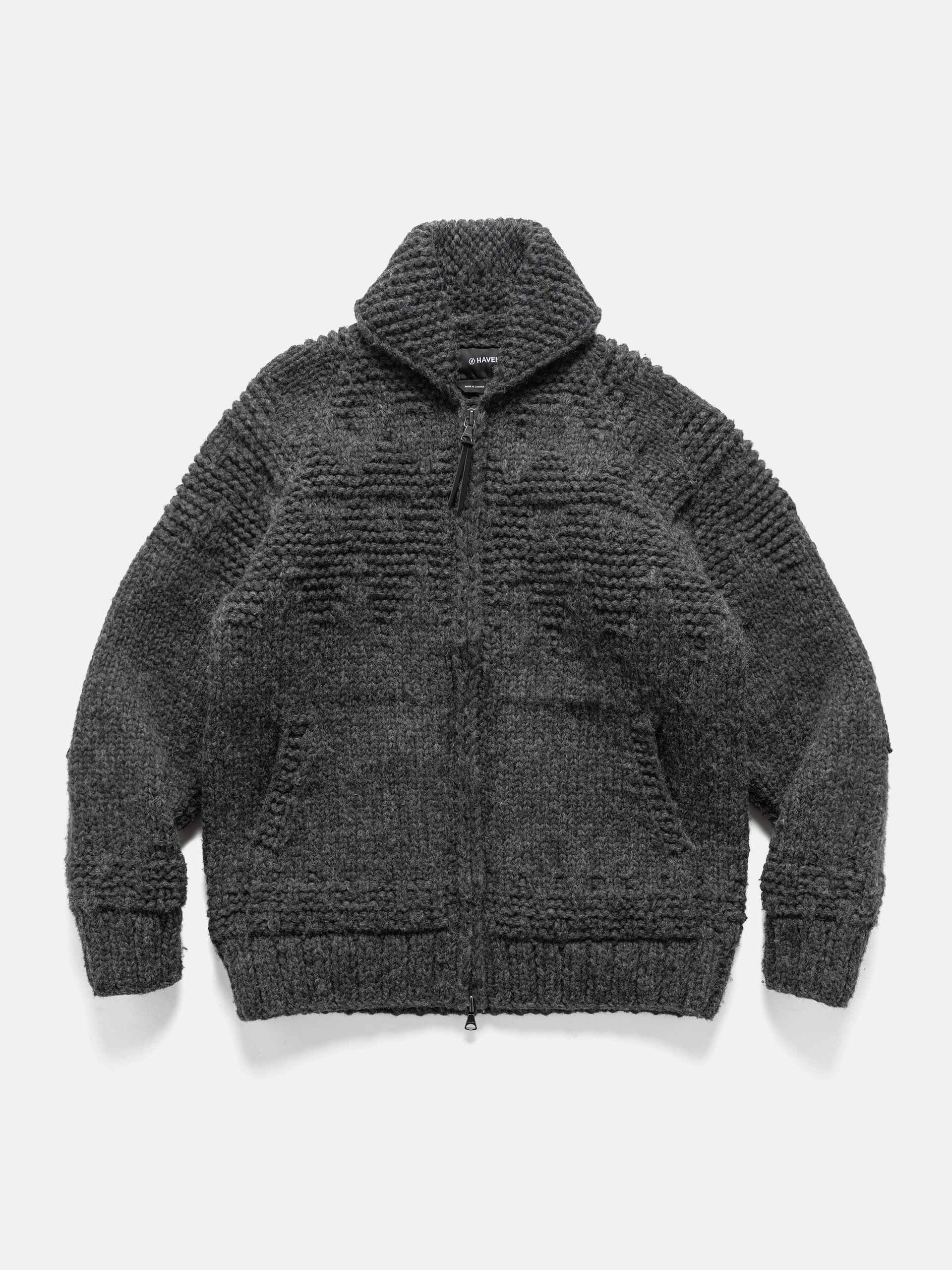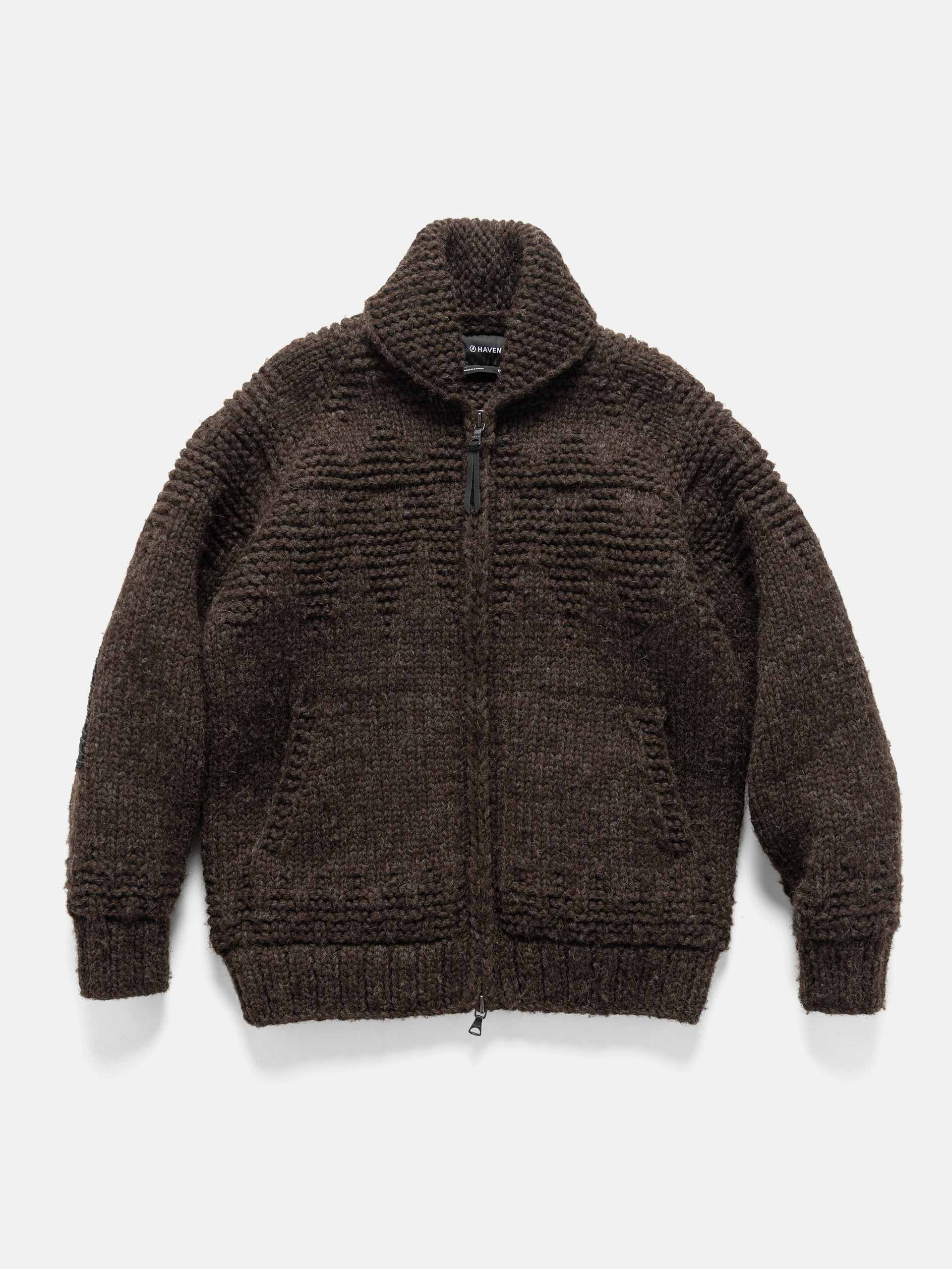 Drawing inspiration from traditional Cowichan sweaters, the HAVEN Pacific Cardigan is meticulously hand-knit in Canada by master artisans. A tonal reinterpretation of classic Nordic winter patterns is achieved through alternating Purl and Jersey stitches, offering subtle texture and depth. The timeless shawl collar and soft deer leather elbow patches, stitched by hand, provide sophisticated protection. A refined take on classic knits, with its dense wool and simple aesthetic, the cardigan offers warmth and versatility throughout the colder months.