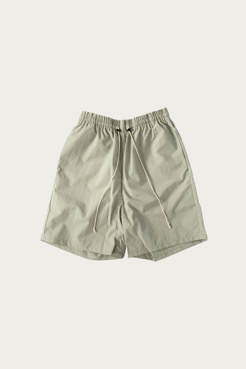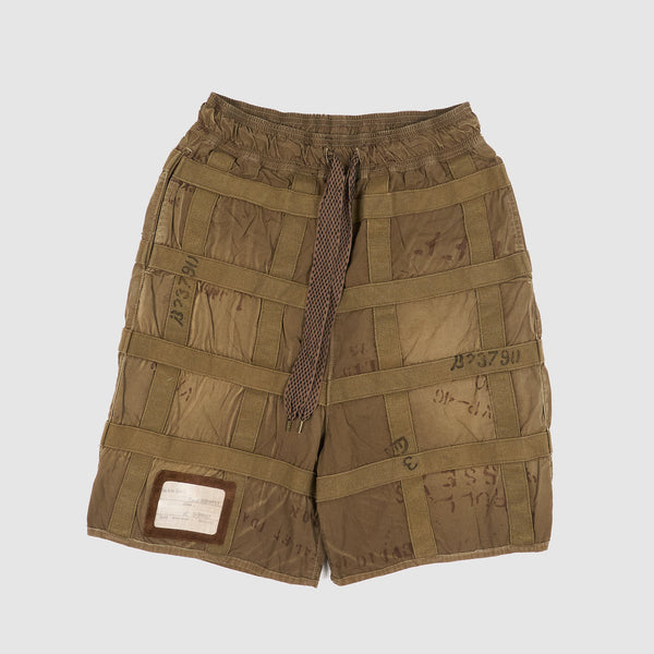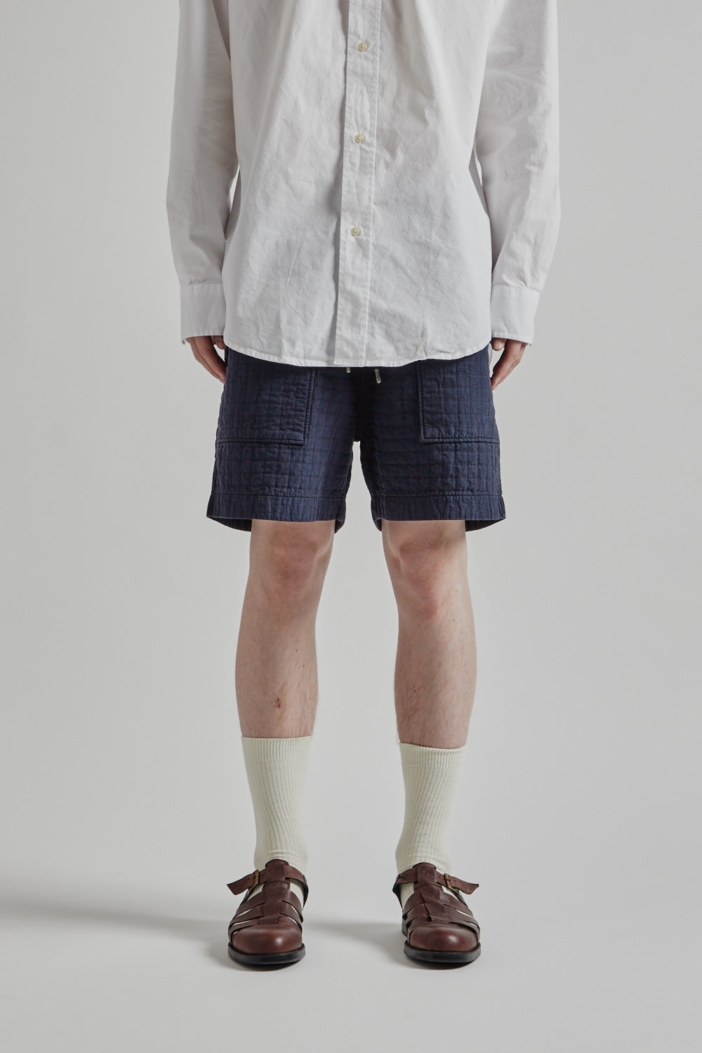 Merging innovation with sustainability, these shorts feature a striking grid motif crafted from upcycled cotton weather fabric and stencil-detailed tape appliqués. The intentionally weathered material offers a dry, textured hand—light yet durable—while the elastic drawstring waist adapts effortlessly to movement. Relax