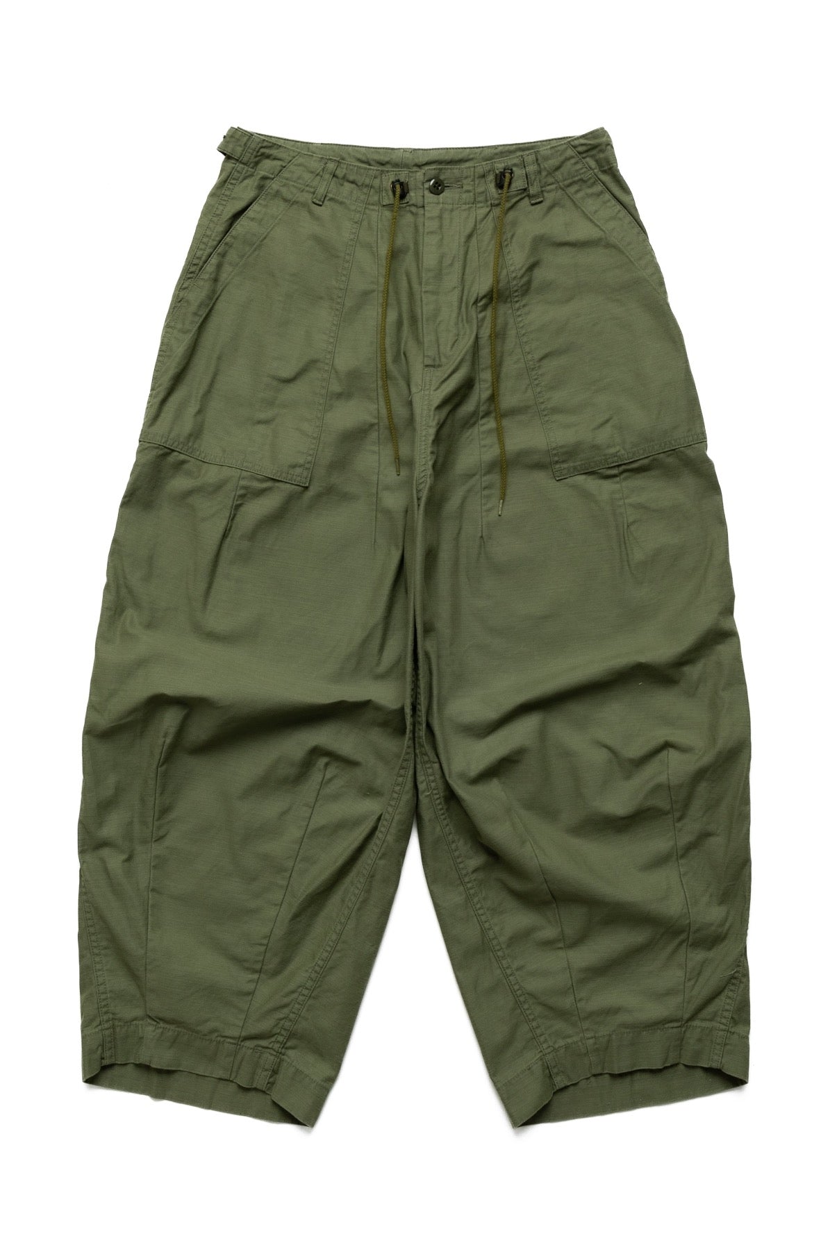 Back satin Waistband with strings A unique silhouette with a large bulging front due to a unique pattern Relaxed fit Fatigue pants design such as front L-shaped pocket and side adjuster Color: Olive 100% cotton Made in Japan Model is 6β²2 wearing a size S TAGGED SIZE XS S M L WAIST 25.25 ~ 33 26.75 ~ 37.5 29 ~ 39 31.5 ~