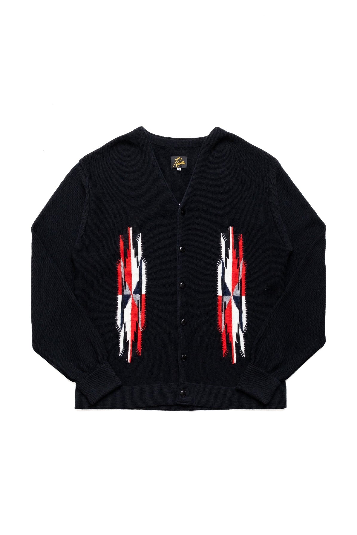 Chimayo pattern V-neck cardigan Buttons with an antique feel Color: Black 100% wool Made in Japan Model is 6β²2 wearing a size M TAGGED SIZE S M L NECK - - - SHOULDER 20 21 22 CHEST 44 44 45 ARM HOLE 20.5 20.5 21 SLEEVE 24 25 25 CENTER BACK 25 26 26 Measurements of actual garment in inches.Click here for our measuring g