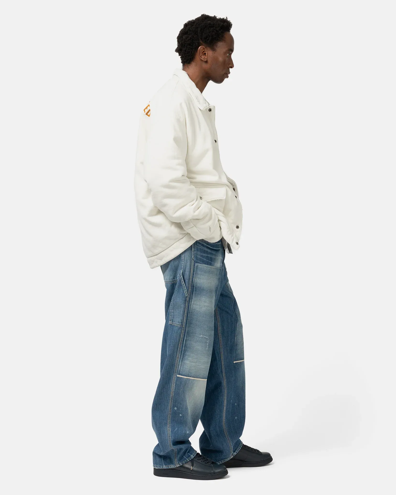 Here, in the coverall silhouette, we find Nakamura's meditation on creative protection. This isn't workwear for the assembly line but armor for the artist, the craftsperson, the modern monk laboring in studios and workshops. The damaged blue moleskin carries the weight of creative struggle, each mark a battle scar earned in service to the craft. To wear this piece is ostensibly to announce one's membership in the guild of makers, the brotherhood of those who build with their hands.