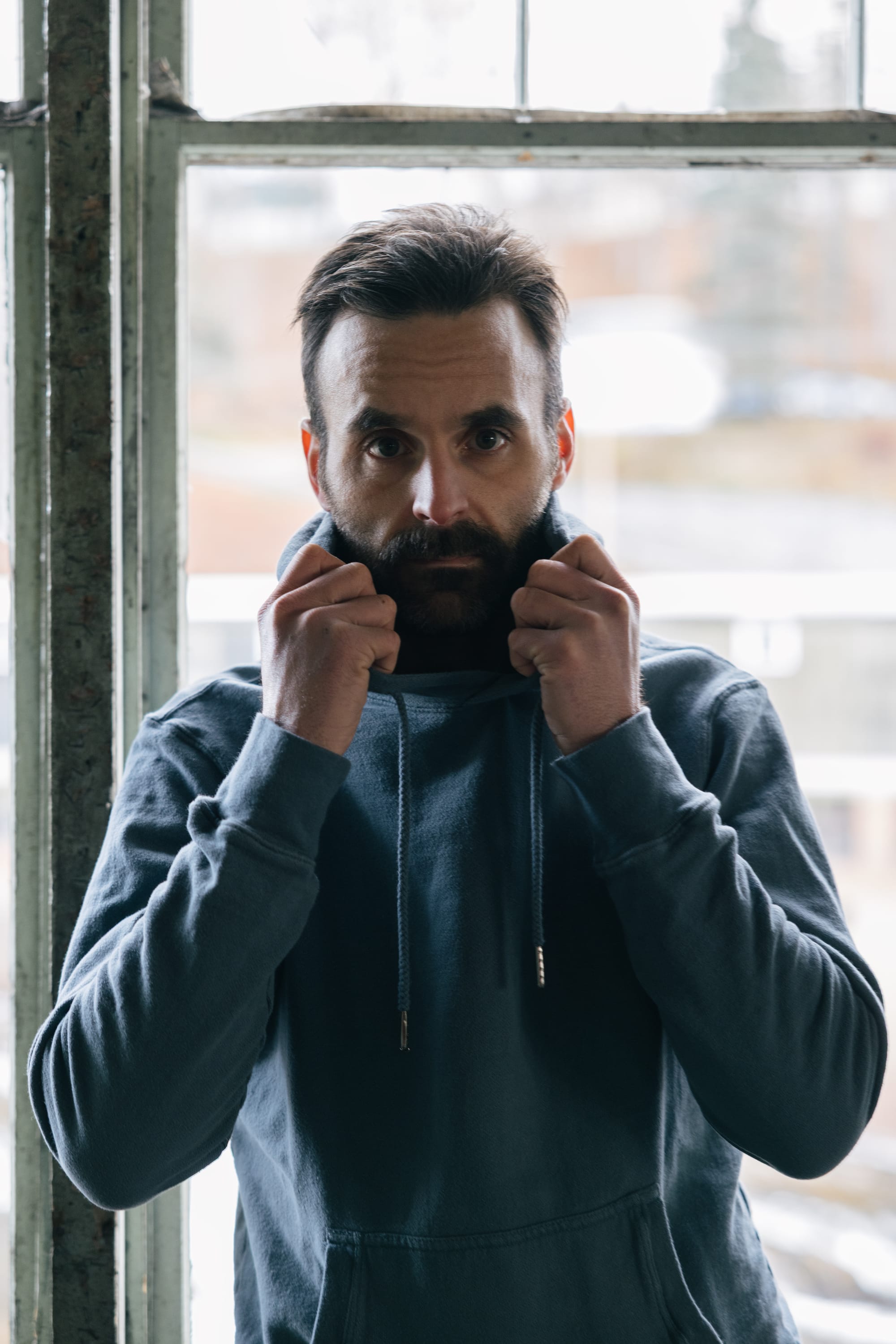 For the Hayes sweatshirt, the custom-developed 10.5 oz organic cotton French terry is locally knitted with a subtle twill-lined face, giving the hoodie a more refined texture than the average fleece. It’s then cut and sewn in East Boston.
