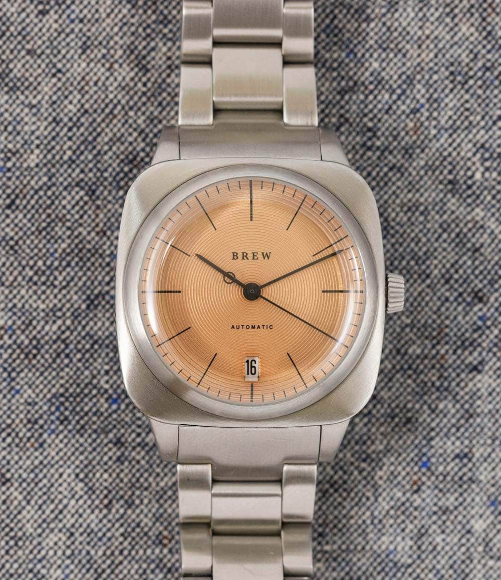 For our third watch collaboration, we’ve teamed up with Brew Watches to make a unique copper dial with circular graining, giving the HP-1 an industrial look.